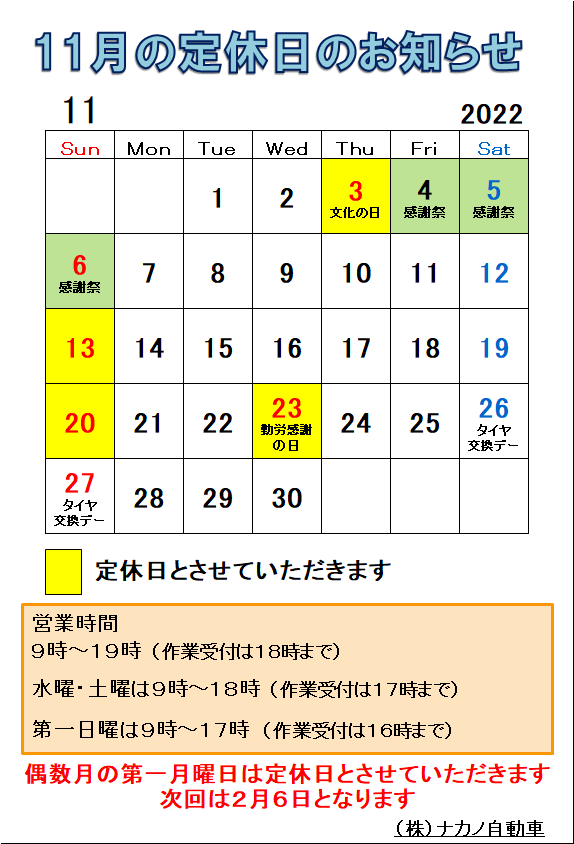 11月の定休日のお知らせです。