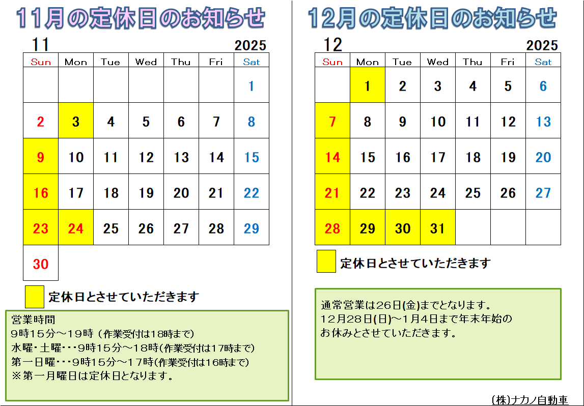 11・12月の定休日のお知らせです。