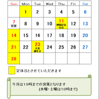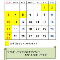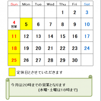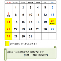 3月の定休日のお知らせです。3月から営業時間は20時までとなりますので、よろしくお願いいたします。(水曜、土曜は…